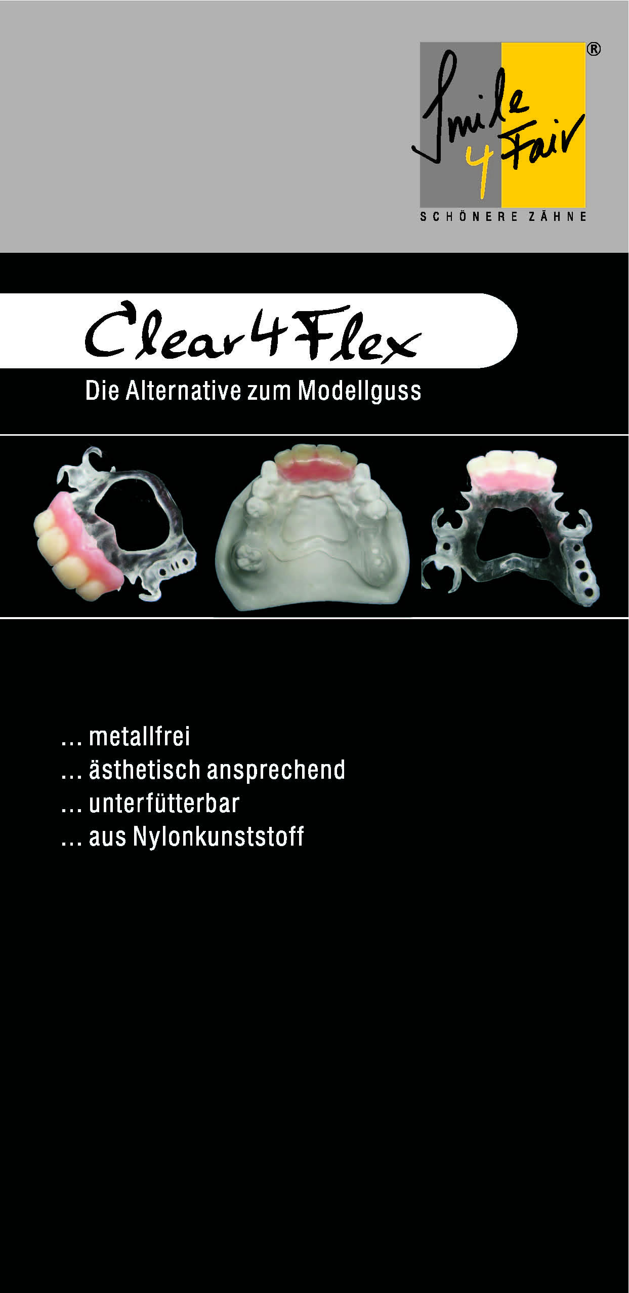 | Smile4Flex ab 4 ers. Zähne | incl. aller Klammern Auf- + Fertigstellung incl. Zähne Auflage Nylon |